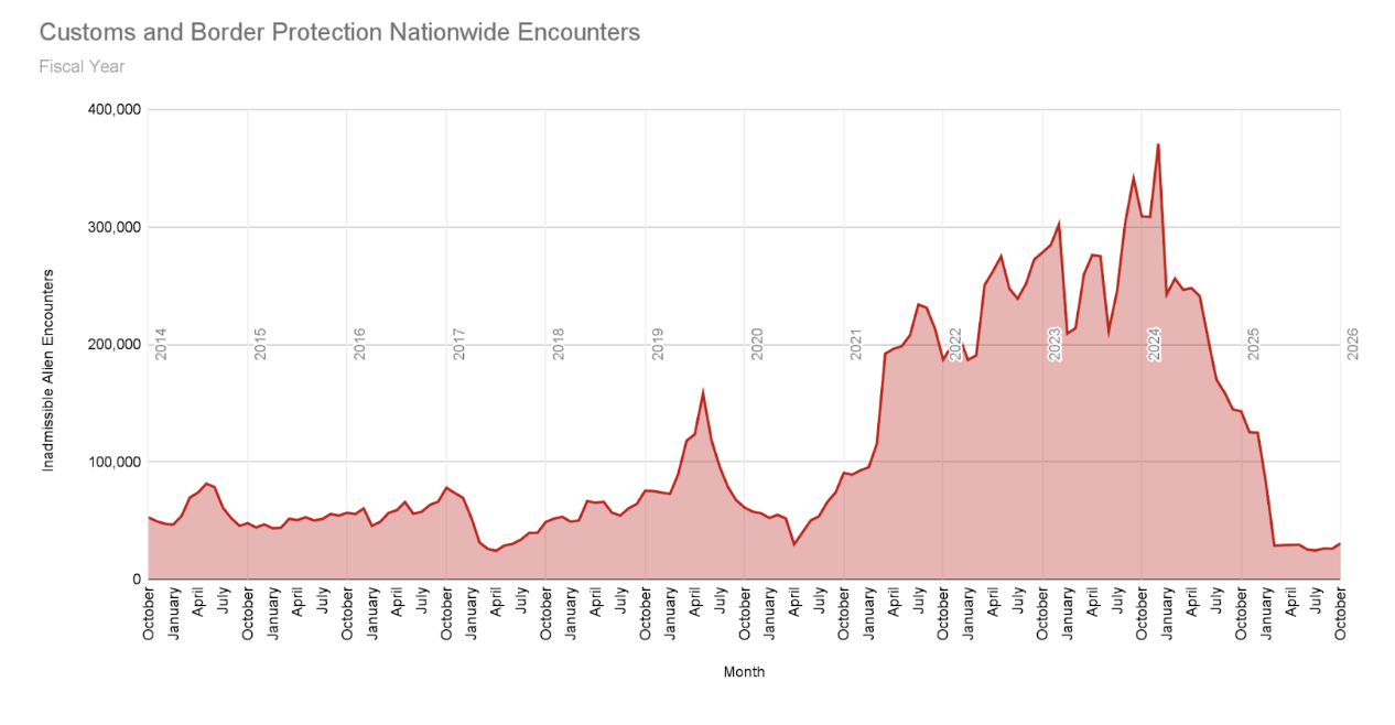 According to the release, CBP encountered 30,561 illegal aliens nationwide, representing a 79% decline since October of 2024, when CBP recorded 309,024 encounters.